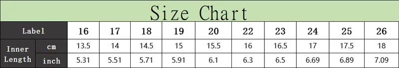 NOTA: não há tamanho padrão para sapatos infantis, escolha de acordo com o comprimento interno dos sapatos +0,5 cm ou 1 cm.